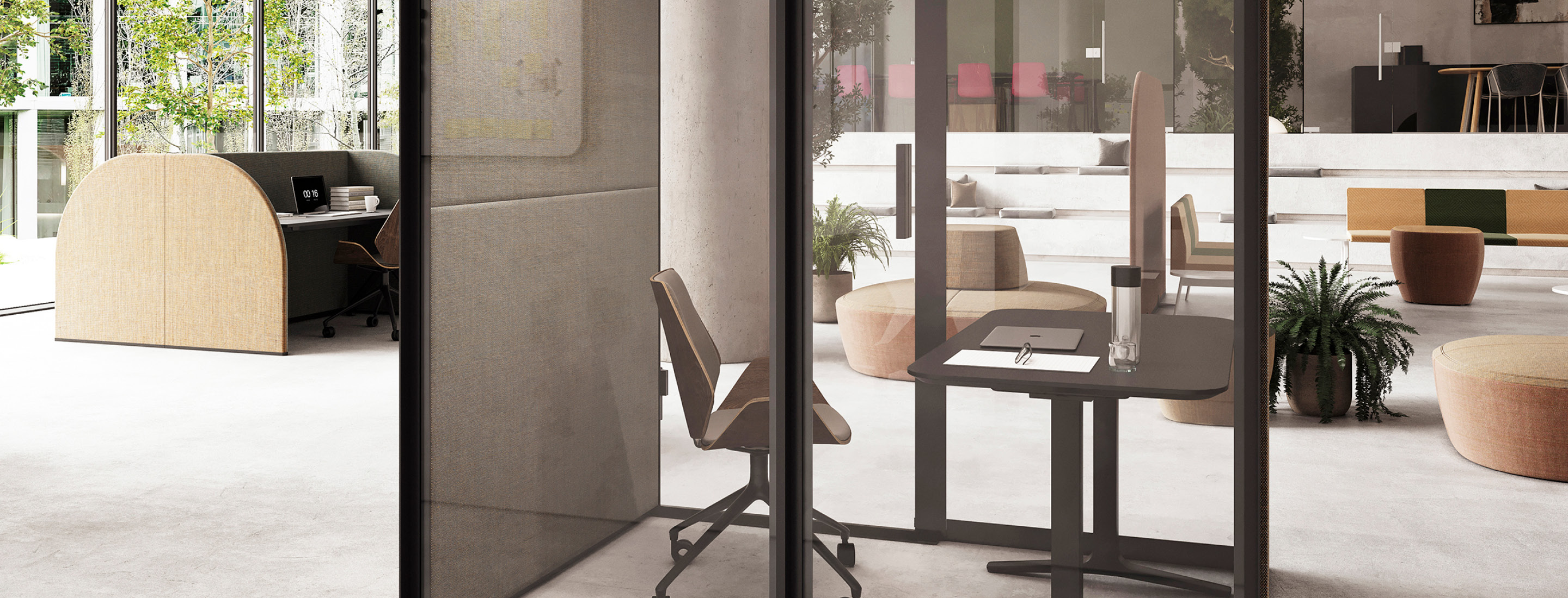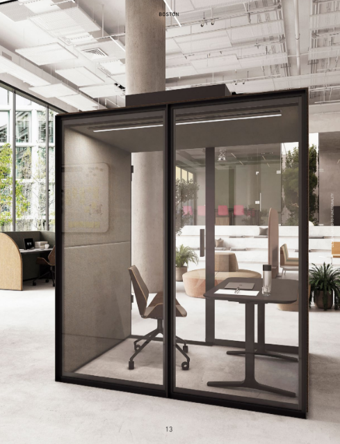 Equipped with glass on both sides, the Boston Workpod is a pleasant flexible workspace for concentration without being completely isolated from its surroundings.