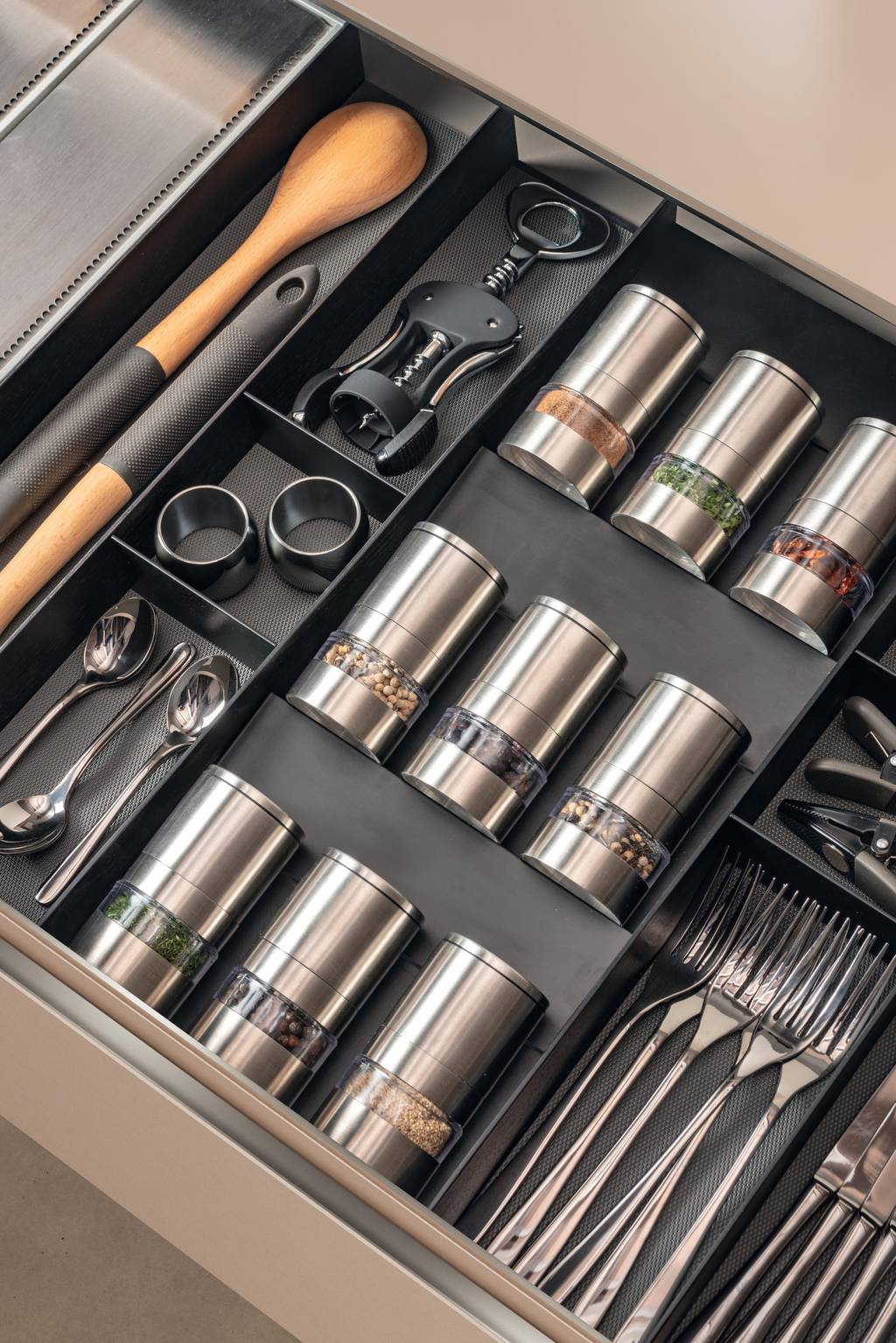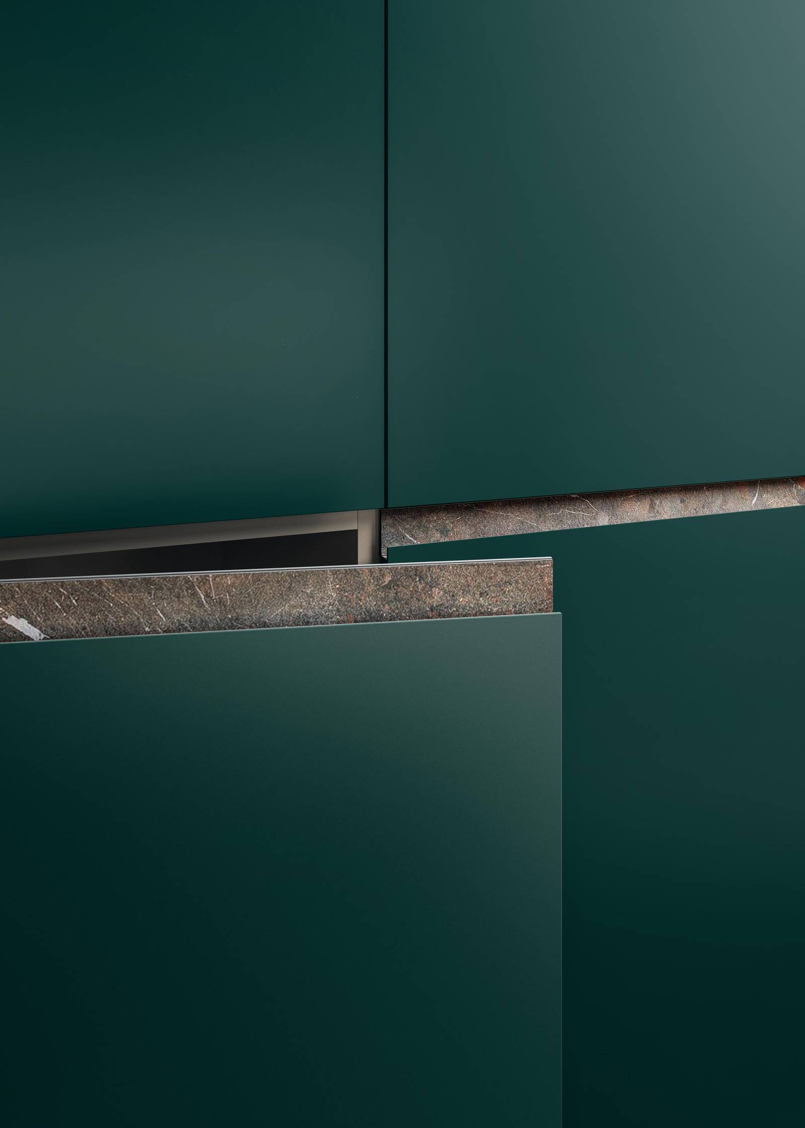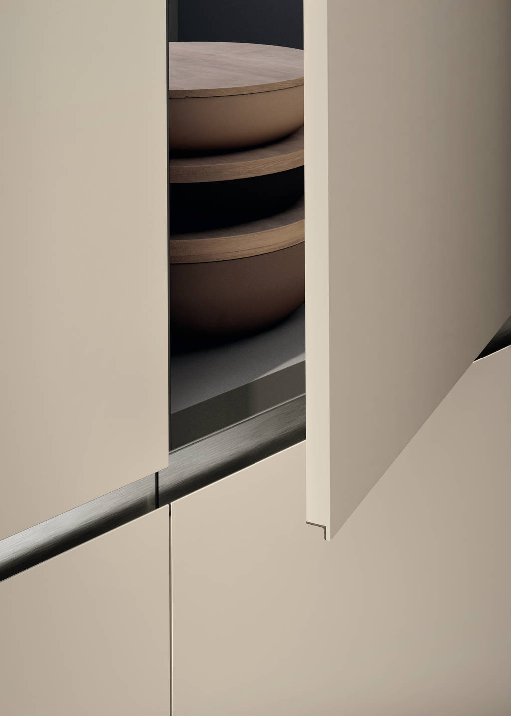 The interior finish can be chosen to match the door or top, or contrast to emphasise different sizes and depths. A brushed-steel profile features strips of glass or MDi to protect it and give the opening an ultra-ergonomic, resistant finish.