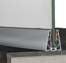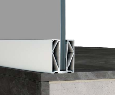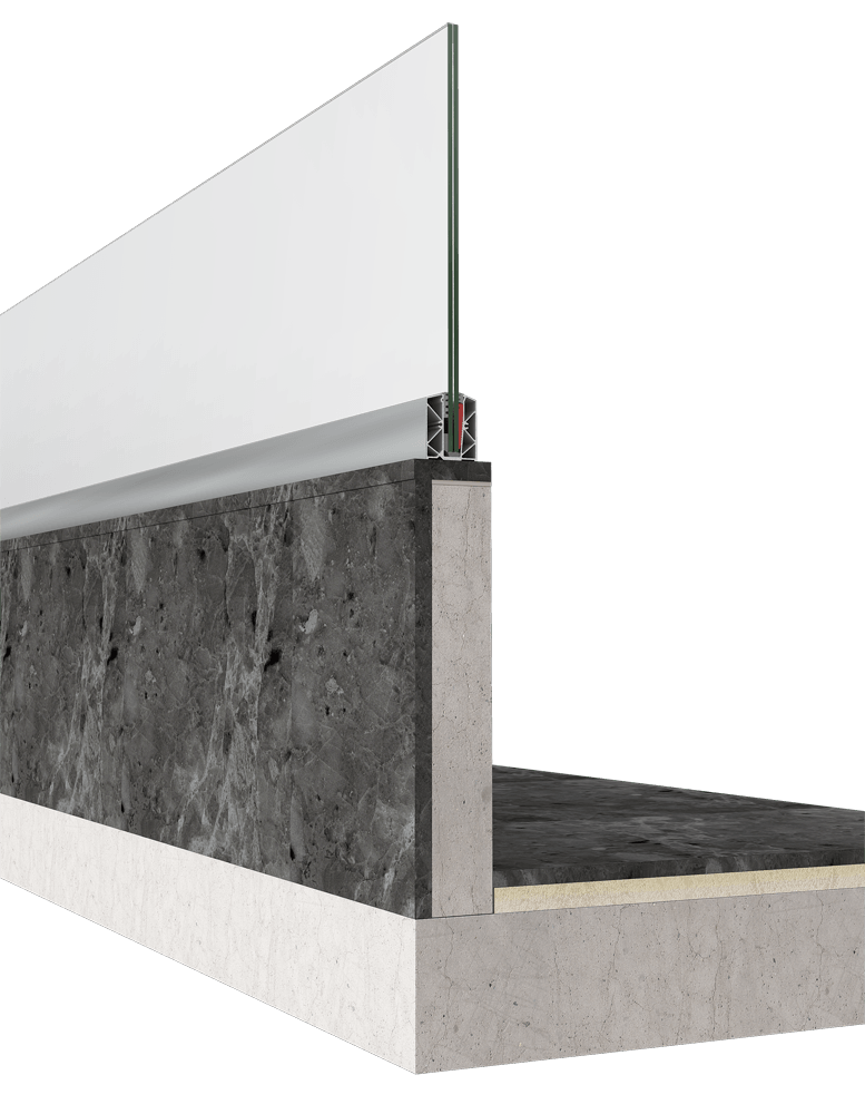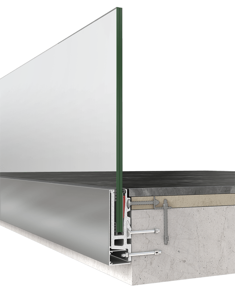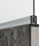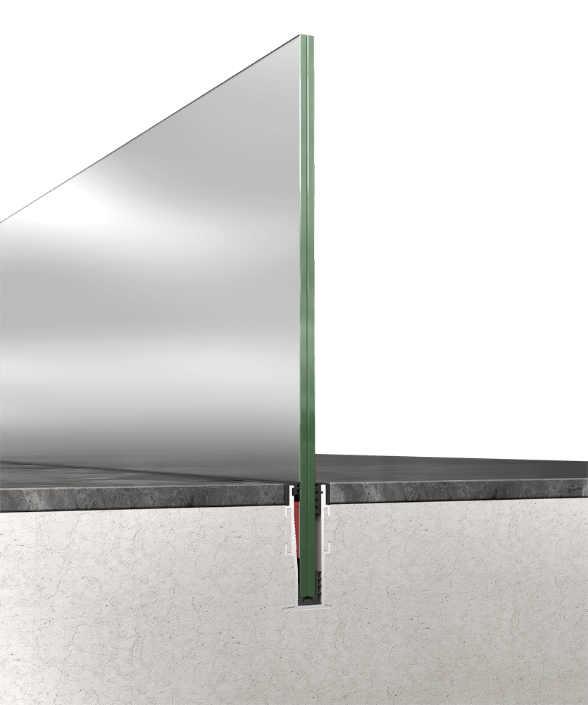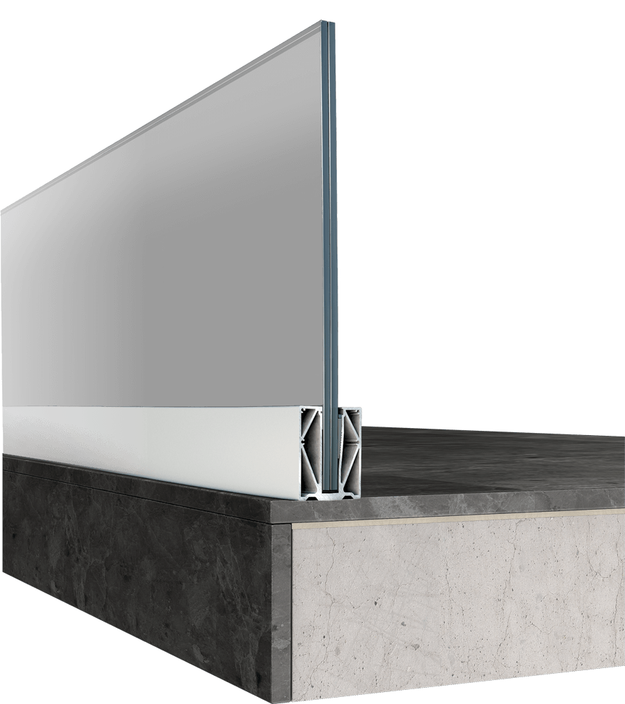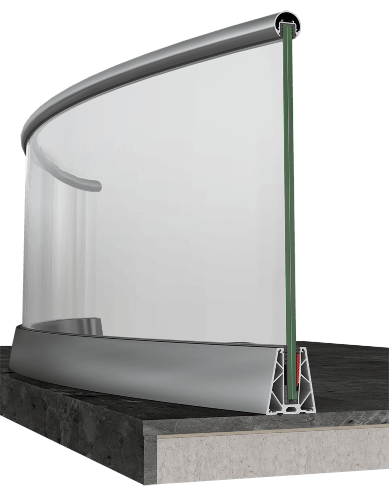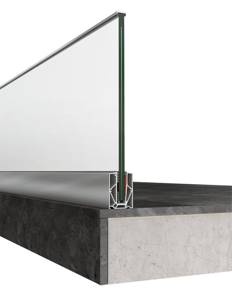 Vertical glass support system for glass railings of modern aesthetics and top robustness. Continuous base profiles without mullions, to leave the visual field free and offer a sense of luxurious freedom.